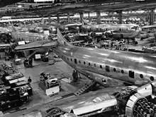 The Boeing 377 Stratocruiser was a civil derivative of the Boeing Model 367, the Boeing C-97 Stratofreighter, which first flew in late 1944. William Allen, who had become president of the Boeing Company in September 1945, sought to introduce a new civilian aircraft to replace reduced military production after World War II.[4] Boeing saw in their large-bodied, fast, and long-ranged military transport potential for a passenger aircraft suited for premium service on long transoceanic routes, expanding on the precedent set by their Boeing 314 Clipper with Pan American World Airways. Despite a recession in late 1945, Allen ordered 50 Stratocruisers, spending capital on the project without an order from an airline customer.[5] His gamble that customers would be interested in Boeing's unique and expensive new airplane turned out to be correct for a brief period.