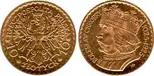 Bolesław's first coins were issued around 995.[20] One of them bore the inscription Vencievlavus, showing that he regarded his mother's uncle Duke Wenceslaus I of Bohemia as the patron saint of Poland.[21] Bolesław sent reinforcements to the Holy Roman Empire to fight against the Polabian Slavs in summer 992.[22][23] Bolesław personally led a Polish army to assist the imperial troops in invading the land of the Abodrites or Veleti in 995.[22][23][24] During the campaign, he met the young German monarch, Otto III.[25]