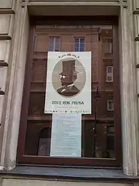 A 1982 plaque on Warsaw University's administration building, the historic Kazimierz Palace, commemorates Prus's years at the University in 1866–68. Across the street (Krakowskie Przedmieście) from the University, in Holy Cross Church, a 1936 plaque by Prus's nephew Stanisław Jackowski, featuring Prus's profile, is dedicated to the memory of the "great writer and teacher of the nation."[96]