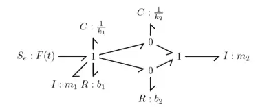 Next you want to add the sources and I bonds on the 1-junction where they act. There is one source, the source of effort (force) and one I bond, the mass of the mass both of which act on the 1-junction of the mass. The result is shown below.