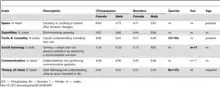 - Gruber, Thibaud; Clay, Zanna; Zuberbühler, Klaus (1 December 2010). "A comparison of bonobo and chimpanzee tool use: evidence for a female bias in the Pan lineage". Animal Behaviour. 80 (6): 1023–1033. doi:10.1016/j.anbehav.2010.09.005. ISSN 0003-3472. Retrieved 30 January 2021.