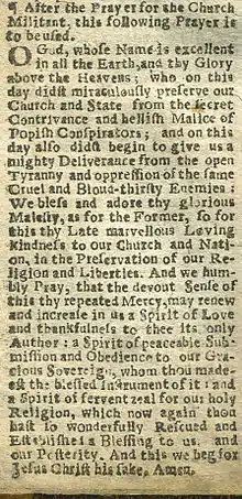 Between 1662 and the 19th century, further attempts to revise the Book in England stalled. On the death of Charles II, his brother James, a Roman Catholic, became James II. James wished to achieve toleration for those of his own Roman Catholic faith, whose practices were still banned. This, however, drew the Presbyterians closer to the Church of England in their common desire to resist 'popery'; talk of reconciliation and liturgical compromise was thus in the air. But with the flight of James in 1688 and the arrival of the Calvinist William of Orange the position of the parties changed. The Presbyterians could achieve toleration of their practices without such a right being given to Roman Catholics and without, therefore, their having to submit to the Church of England, even with a liturgy more acceptable to them. They were now in a much stronger position to demand changes that were ever more radical. John Tillotson, Dean of Canterbury pressed the king to set up a commission to produce such a revision.[77] The so-called Liturgy of Comprehension of 1689, which was the result, conceded two thirds of the Presbyterian demands of 1661; but, when it came to convocation the members, now more fearful of William's perceived agenda, did not even discuss it and its contents were, for a long time, not even accessible.[78] This work, however, did go on to influence the prayer books of many British colonies.