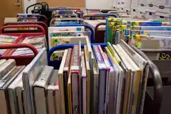 A book truck or book cart is a small wheeled vehicle, typically with two or three shelves, used in libraries to move books.[1]