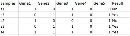 The original dataset contains several entries of samples from s1 to s5. Each sample has 5 features (Gene 1 to Gene 5). All samples are labeled as Yes or No for a classification problem.