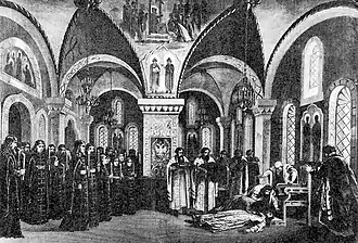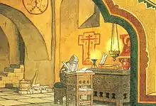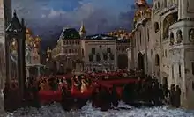 The Revised Version of 1872 received its world premiere on 27 January 1874 at the Mariinsky Theatre. The Cell Scene was omitted. The Novodevichiy and Coronation scenes were combined into one continuous scene: 'The Call of Boris to the Tsardom'. Matvey Shishkov's design for the last scene of Pushkin's drama, 'The House of Boris' (see illustration, right), was substituted for this hybrid of the Novodevichiy and Coronation scenes.[38] The scenes were grouped in five acts as follows:[39]