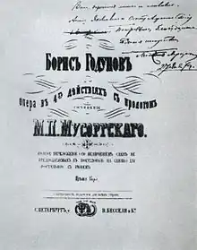 When Lyudmila Shestakova, the sister of Mikhail Glinka, learned of Mussorgsky's plans, she presented him with a volume of Pushkin's dramatic works, interleaved with blank pages and bound, and using this, Mussorgsky began work in October 1868 preparing his own libretto.[13] Pushkin's drama consists of 25 scenes, written predominantly in blank verse. Mussorgsky adapted the most theatrically effective scenes, mainly those featuring the title character, along with a few other key scenes (Novodevichy, Cell, Inn), often preserving Pushkin's verses.[14]