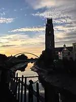The town was once held to have been a Roman settlement, but no evidence shows this to be the case.[4] Similarly, it is often linked to the monastery established by the Saxon monk Botolph at "Icanhoe" on the Witham in AD 654 and destroyed by the Vikings in 870,[4] but this is now doubted by modern historians. The early medieval geography of The Fens was much more fluid than it is today, and at that time, the Witham did not flow near the site of Boston. Botolph's establishment is most likely to have been in Suffolk. However, he was a popular missionary and saint to whom many churches between Yorkshire and Sussex are dedicated.