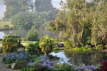 "Foltiere" is the name of the estate, which means "ground where beech trees grow", the word "fou" being ancient french for "beech tree". The park was created in 1847,[1] around the Château de la Foltière. In 1796 the old manor house was the headquarters of an uprising against the government of the French Republic led by Count Joseph de Puisaye.[2] In 1820, the Estate of "La Foltière" is bought by the family Frontin des Buffards.[2] In 1847, the land surrounding the pond in the park was redesigned as an English romantic landscape garden, with winding paths that follow the terrain, and a view from the lawn in front of the house to the church tower in the village.