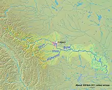 The Bow River is a river in Alberta, Canada. It begins within the Canadian Rocky Mountains and winds through the Alberta foothills onto the prairies, where it meets the Oldman River, the two then forming the South Saskatchewan River. These waters ultimately flow through the Nelson River into Hudson Bay.[1] The Bow River runs through the city of Calgary, taking in the Elbow River at the historic site of Fort Calgary near downtown. The Bow River pathway, developed along the river's banks, is considered a part of Calgary's self-image.[2]:41–2