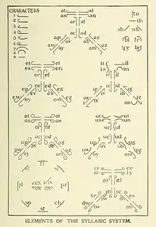In addition to these syllables, there are several additional characters including a simple straight line, a shallow curve, and a line with a curl at the end. These are assigned arbitrarily to combinations of sounds such as "fl," "sp," "gr," and "ch." The 1912 edition of the system expands the use of these characters to include longer sequences like "contr" and "circum."