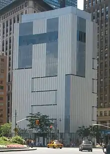 Cloepfil used the same massing and geometric shape as dictated by the city zoning regulations, and carved channels into the structure to bring in natural light. The redesigned building replaced the original white Vermont Marble with a glazed terra-cotta and glass facade. The aim behind the design was to underline the iconic presence of this 10-storey building and respond to the needs of the institution that will occupy it. The terra-cotta and glass covering evokes the principal theme of the collection, a look at different traditions in contemporary craft practice.[14] The tiles were developed in collaboration with Dutch ceramics company Royal Tichelaar Makkum with a custom glaze by artist Christine Jetten.[15]