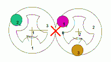 The speed of a horn gear braider is limited by the effort needed to force bobbin carriers to follow a serpentine path. In 1922, Simon W. Wardwell solved this problem by moving the strands of yarn instead of the carriers, allowing the carriers to follow a simple circular path.[6] The carriers are in two counter-rotating rings, while lever arms driven by a cam guide the strands of yarn from the outer ring up and down between the carriers of the inner ring. Because a lever arm has much less mass than a bobbin and carrier, the machine can run faster.