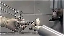 Donoghue's group reported training rhesus monkeys to use a BCI to track visual targets on a computer screen (closed-loop BCI) with or without assistance of a joystick.[31] Schwartz's group created a BCI for three-dimensional tracking in virtual reality and also reproduced BCI control in a robotic arm.[32] The same group also created headlines when they demonstrated that a monkey could feed itself pieces of fruit and marshmallows using a robotic arm controlled by the animal's own brain signals.[33][34][35]