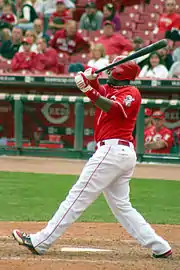 On April 10, 2012, it was announced that Phillips and the Reds had agreed to a 6-year, $72.5 million contract, through the 2017 season.[23] Phillips was represented in contract negotiations by ACES Inc.[24] When the All-Star game roster was announced on July 1, Phillips was not amongst those voted in by either fans or National League players and coaches. Reds manager Dusty Baker took exception at retired St. Louis Cardinals manager but the National League's All-Star Game manager Tony La Russa, claiming Phillips and fellow Reds teammate Johnny Cueto were left off the roster because they were at the heart of an on-field fight involving Baker's Reds and La Russa's Cardinals in 2010. Baker stated "it just kind of looks bad that Johnny and Brandon were at the center of the skirmish between us and the Cardinals. Some of the Cardinals that aren't there any more are making some of the selections." Phillips, who was hitting just under .290 with 10 HR and 46 RBI at the time the selections were announced, declined to comment on the matter.[25] USA Today's Mike Jones mentioned the large number of votes for San Francisco Giants players, including Pablo Sandoval (.300, 6 HR, 25 RBI) who was named the All-Star game's third baseman over New York Mets' David Wright (over .350, 9 HR, 50 RBI) was responsible for "taking away an infield spot."[26]