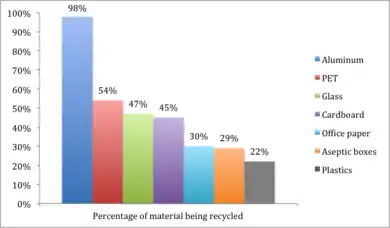 Despite its low overall recycling rate, Brazil is the world leader in recycling aluminum. Having set a record recycling rate of 98,4% of aluminum, the country was able to top its record 97,1% from 2013 by another 1,3%.[36] The main reason for the extreme aluminum recycling rate are the rising energy costs - which will continue to rise given the increasing hydropower prices caused by the 2015 drought - and consequently, the high expenses that are associated with the production of new aluminum. As between March 2014 and March 2015 the cost of energy rose by 60% and since recycling aluminum requires 95% less energy than producing new material, the recycling rates have kept rising while smelter plants have been shutting down production.[37][38] PET is the second most recycled packaging material in Brazil with 54% of PET having been recycled in 2014. However, due to lower production costs this rate is yet much smaller than the percentage of recycled aluminum. Given its very low production costs as well as the more expensive processes needed to recycle the material, plastics exhibit the lowest recycling rate among the most common packaging materials. The Brazilian beauty care and cosmetics brand Sejaa serves as an example for products that use recycled packaging. Sejaa, which was launched by Brazilian fashion model Gisele Bündchen uses fibers consisting to 100% of recycled post-consumer waste paper and is Forest Stewardship certified.[39][40] Another example is Brazilian pulp and paper manufacturer Suzano, which since 2012 produces paperboard made from Post consumer resin (PCR) by extracting fibers from long life packaging[41] such as milk cartons.[42][43]