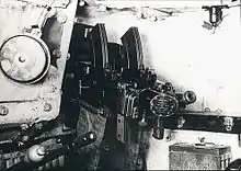 The Italians have also adapted it for use as an infantry machine gun.[2] For this purpose the gun is mounted on a machine-gun tripod...by means of an adapter, and is fitted with a temporary rear sight on the right of the body and a temporary front sight on the right of the barrel at the muzzle. These temporary open sights take the place of the optical sight used when the gun is tank-mounted.