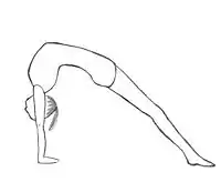 In yoga, this particular pose is called Chakrasana, Urdhva Dhanurasana, or Wheel, while the Westernized nickname "Bridge pose" refers to a less rigorous supine backbend called Setu Bandha Sarvangasana, in which the body is fairly straight from knees to shoulders, and most of the bend is in the knees.