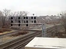 The Brighton Park crossing is a major railroad crossing in Chicago, Illinois, hosting three of the major Chicago freight railroads. The crossing is northwest of the intersection of Western Avenue and Archer Avenue, in the Brighton Park neighborhood of Chicago, Illinois. The railroads involved in the crossing are CSX, Canadian National and Norfolk Southern. The crossing consisted of the CN's two-track line in a roughly east–west orientation, crossing the five north–south tracks operated by NS and CSX. Collectively, these railroads operate approximately 80 trains per day through the crossing.[1] The CN line was formerly the main line of the Gulf Mobile & Ohio and its predecessor Alton Railroad and currently carries Metra Heritage Corridor commuter trains and Amtrak passenger trains to St. Louis. The GM&O's Brighton Park passenger stop was at this location. The junction may be easily viewed from the CTA Orange Line trains that pass on an elevated structure immediately southeast of the crossing. Brighton Park station, located near the crossing on what is now the Metra Heritage Corridor, was closed in 1984.[2]
