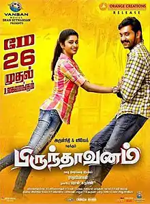 Brindavanam is a 2017 Indian Tamil language comedy drama film directed by Radha Mohan and produced by Shan Sutharsan.[2] The film stars Arulnithi and Vivek in the lead roles, while Tanya portrays the leading female role. Featuring music composed by Vishal Chandrasekhar, the film began production during August 2016 and was released on 26 May 2017.[3][4]