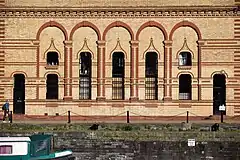 Many buildings in the style have been destroyed or demolished, but notable surviving examples include the Colston Hall,[1] the Granary on Welsh Back, the Carriage Works[2] on Stokes Croft and several of the buildings around Victoria Street. Several of the warehouses around the harbour have survived including the Arnolfini, which now houses an art gallery.[3] Clarks Wood Company warehouse[4] and the St Vincent's Works[5] in Silverthorne Lane and the Wool Hall[6] in St Thomas Street are other survivors from the 19th century.
