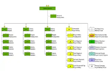 The 1939 infantry division had a theoretical establishment of 13,863 men. By 1944, the strength had risen to 18,347 men.[24] This increase in manpower resulted mainly from the increased establishment of a division's subunits and formations; except for certain specialist supporting services, the overall structure remained substantially the same throughout the war. A 1944 division typically was made up of three infantry brigades; a Medium Machine Gun (MMG) battalion (with 36 Vickers machine guns, in three companies, and one company of 16 4.2-inch mortars); a reconnaissance regiment; a divisional artillery group, which consisted of three motorised field artillery regiments each with twenty-four 25-pounder guns, an anti-tank regiment with forty-eight anti-tank guns and a light anti-aircraft regiment with fifty-four Bofors 40 mm guns;[25] three field companies and one field park company of the Royal Engineers; three transport companies of the Royal Army Service Corps; an ordnance field park company of the Royal Army Ordnance Corps; three field ambulances of the Royal Army Medical Corps, a signals unit of the Royal Corps of Signals; and a provost company of the Royal Military Police.[25] During the war, the Royal Electrical and Mechanical Engineers was formed to take over the responsibility of recovering and repairing vehicles and other equipment. A division generally had three workshop companies, and a recovery company from the REME.