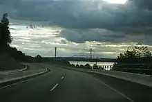 On the Mainland, Highway 17 is known as the South Fraser Perimeter Road (SFPR), a component of the British Columbia Ministry of Transportation's Gateway Program. It is a four-lane expressway with a speed limit of 80 km/h (50 mph) over most of its length, connecting the Tsawwassen Ferry Terminal and Highway 99 in Delta to Highway 1 at 176th Street in Surrey, and providing access to all five of the major Fraser River crossings in Metro Vancouver.[5] The mainland section is notable for its extensive use of noise walls, split level construction through Delta and use in some urban sections of so-called Quiet Pavement to reduce traffic noise.[6]