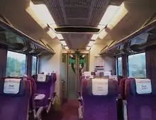 In June 2017, TransPennine Express began refurbishing Class 185s as part of their franchise commitments.[56] The first unit was completed in July 2017, entering service within the same week. The refurbished trains include new seats throughout the train (including leather in First Class), standard plug and USB sockets at every pair of seats, a new wooden style decor, refitted toilets and LED lighting throughout. The refurbishment was completed in 2018.[57]