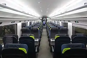 The 22 sets still operating for Eurostar were refurbished in 2004/05 with a new interior, designed by Philippe Starck.[13][14] The grey-yellow look in standard class and the grey-red look in first class were replaced with a more grey-brown scheme in standard and a grey-burnt orange in first class.