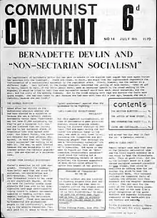 In the initial stages of the conflict in Northern Ireland, the ICO (as it then was) took part along with the IRA in the defence of Catholic areas from Protestant attacks.[7] It was critical of both the IRA leadership and of the people who later created the Provisional IRA. The ICO line was the Two Nations Theory - that the Ulster Protestants were or had the potential to become a nation in their own right,[8] and that Irish Catholics could not determine the whole of the island of Ireland as a country. Their seminal publication on the question was The Economics of Partition which ran to many editions. Another important ICO publication was Connolly and Partition, described by the ICO magazine the Irish Communist as offering a "Stalinist analysis" of Connolly's ideas.[9] Following the adoption of this pro-Unionist position, the ICO withdrew and destroyed their earlier pro-Republican pamphlets. A number of members were opposed to this new direction (including Jim Lane) and resigned to form the Cork Workers' Club.[10][11]