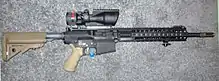 In light of operational experience gained during Operation Herrick in Afghanistan and Operation Telic in Iraq, a number of additions to the L85A2 have entered service as Urgent Operational Requirements but over time have become standard. The most noticeable addition has been that of a Picatinny Rail Interface System designed and manufactured by US company Daniel Defense, which replaces the original green plastic front furniture. The RIS system often sports rubber rail covers in coyote brown colour and a GripPod vertical down grip / bipod unit. The Oerlikon Contraves LLM-01 laser and sight combo has been standard for some time, but a new laser/light unit by Rheinmetall has been recently cleared for service. Two different x4 optical infantry sights have seen service in addition to the SUSAT. The Trijicon TA-31 ACoG with a red dot CQB sight was purchased as a UOR and latterly a replacement for the SUSAT has entered service namely the Elcan Specter OS4X also with a red dot CQB sight mounted on it. Additionally, an alternative flash eliminator can be fitted, an open ended four pronged design by Surefire. The Surefire flash eliminator gives improved flash elimination, can accept the standard bayonet and also accommodate a Surefire sound suppressor. The Surefire flash eliminator is only for operational use it being incompatible with the standard L85A2 Blank Firing Attachment. Polymer magazines manufactured by Magpul called the EMAG have also been purchased to replace steel magazines in operational environments slightly easing the infantryman's weight burden.