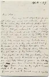 Charlotte wrote four long, very personal, and sometimes vague letters to Monsieur Héger that never received replies. The extent of Charlotte Brontë's feelings for Héger were not fully realised until 1913, when her letters to him were published for the first time. Héger had first shown them to Mrs. Gaskell when she visited him in 1856 while researching her biography The Life of Charlotte Brontë, but she concealed their true significance. These letters, referred to as the "Héger Letters", had been ripped up at some stage by Héger, but his wife had retrieved the pieces from the wastepaper bin and meticulously glued or sewn them back together. Paul Héger, Constantin's son, and his sisters gave these letters to the British Museum,[67][76] and they were shortly thereafter printed in The Times newspaper.[77]