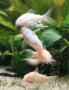 The albino corydoras is an albino variety of the bronze corydoras that has been developed for the aquarium trade, with a pale pink or orange body and red eyes. It is physically similar to normally-colored individuals, although some breeders report that the fry are a little slower to develop. Others say that the albinos are practically blind and that the males are somewhat sterile, although this may be due to extensive inbreeding. Albino bronze corydoras are frequently injected with bright dye (via a needle) and sold in aquariums. This controversial practice is known as "painting" or "juicing" fish.