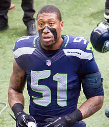 Bruce Pernell Irvin Jr. (born November 1, 1987) is an American football outside linebacker for the Seattle Seahawks of the National Football League (NFL). He was drafted by the Seahawks in the first round of the 2012 NFL Draft. Irvin won Super Bowl XLVIII over the Denver Broncos, and also played in Super Bowl XLIX where he became the first player ever to be ejected from a Super Bowl. He played college football at West Virginia.