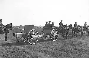In peacetime, the Bulgarian Land Forces consisted of three armies, ten infantry divisions, forty infantry regiments, nineteen artillery regiments, eleven cavalry regiments, five battalions of engineers, one railway battalion, one telegraph battalion and one technical battalion.[78] These forces retained the territorial organization established prior to the First Balkan War. The country was divided in three army inspectorates, ten Division districts and forty Regiment districts. During wartime, the staff of each of these administrative units formed the headquarters and staff of a separate army, division and regiment. All male Bulgarian subjects were eligible to serve in the army when they reached the age of 20. At that age, they were conscripted for a period of two years in the infantry and three years in other branches of the Active (Standing) Army. Following this period, a person was enrolled for another 18 years in the infantry or 16 years in other branches of the Active Army Reserve. This Reserve was the heart of the army, as it encompassed the bulk of the available manpower and reached a size of 374,613 men by the end of 1914.[79] Finally, the men between 40 and 48 years served in the National Militia (Narodno Opalchenie) which was divided in two "Ban's." Initially, the First Ban was composed of men 41 to 44 years old and the Second Ban was composed of men 45 to 48 old. Around 1914, due to the experience of the Balkan Wars, the men between 45 and 46 years old that belonged to the Second Ban were formed into separate Etappe Troops. By early 1915, the Bulgarian Army could rely altogether on some 577,625 trained men aged 20 to 48.[79] A special inquiry also determined that another 231,572 men were eligible for military service but had not received their training. Many of those were called up and received training in 1915. The principal firearm used by the Bulgarian infantry since the end of the 19th century was the Mannlicher magazine rifle, notably the M95 model but also the 1888 and 1890 models. Other rifles in use by the army include the Mosin–Nagant 1891 model, the Berdan II and a number of Mauser rifles captured from the Ottomans during the First Balkan War. Officers were armed with a variety of pistols and revolvers, including the Parabellum 1908 and Smith & Wesson. Since 1908, the infantry was also armed with the heavy Maxim machine gun.