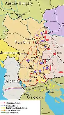 On September 22, Bulgaria declared general mobilization and Radoslavov stated that country would assume a state of "armed neutrality" that its neighbors should not perceive as a threat.[74] This event was indicative of Bulgarian intentions and prompted the Serbians to ask the Entente to support them in a pre-emptive strike on Bulgaria. The Allies were not yet ready to help Serbia in a military way and refused, focusing their efforts instead on finding ways to delay as much as possible the seemingly imminent Bulgarian attack. Sazonov, angered by this "Bulgarian betrayal," insisted that a clear ultimatum should be issued to the Balkan country. The French and the British resisted at first but eventually fell in line with the Russians and on 4 October, the Entente presented an ultimatum demanding all German officers attached to the Bulgarian army be sent back to home within 24 hours.[75] On the previous day, a small Allied force had landed in Salonika. Radoslavov did not reply and on 5 October the Allied representatives asked for their passports and left Sofia.