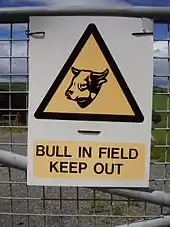 An estimated 42% of all livestock-related fatalities in Canada are a result of bull attacks, and fewer than one in 20 victims of a bull attack survives.[24] Dairy breed bulls are particularly dangerous and unpredictable; the hazards of bull handling are a significant cause of injury and death for dairy farmers in some parts of the United States.[25][26][27] The need to move a bull in and out of its pen to cover cows exposes the handler to serious jeopardy of life and limb.[28] Being trampled, jammed against a wall, or gored by a bull was one of the most frequent causes of death in the dairy industry before 1940.[29] With regard to such risks, one popular farming magazine has suggested, "Handle the bull with a staff and take no chances. The gentle bull, not the vicious one, most often kills or maims his keeper".[30]