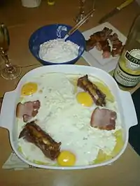 Bulz,[1] also called urs de mămăligă, is a Romanian dish composed by roasting polenta (mămăligă) and cheese in an oven. Bulz is often eaten with sour cream.