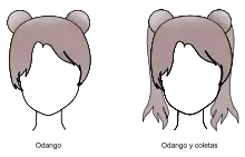 Double or pigtail buns are often called odango[3] (お団子, odango), which is also a type of Japanese dumpling (usually called dango; the o- is honorific).