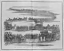 The expedition set off from Royal Park, Melbourne at about 4 pm on 20 August 1860 watched by around 15,000 spectators. The 19 men of the expedition included six Irishmen, five Englishmen, three Afghan and one Indian camel drivers, three Germans and an American. They took 23 horses, 6 wagons and 26 camels.[14]