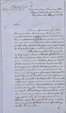 - Burke and Wills Expedition. "Instructions issued to Robert O'Hara Burke, Leader of the Victorian Exploration Expedition. Signed John MaCadam, Secretary, Exploration Committee and dated, 18 August, 1860". Australian Manuscripts Collection State Library Victoria. Retrieved 21 July 2020.