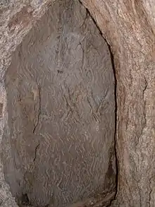 Brahe blazed two trees (27.623902°S 141.075784°E) at Depot Camp LXV on the banks of Bullah Bullah Waterhole on Cooper Creek, both are coolibahs (Eucalyptus coolabah formerly Eucalyptus microtheca) and both are estimated to be at least 250 years old.[20] One tree has two blazes on it; one denoting the date of arrival and the date of departure "DEC-6-60" carved over "APR-21-61" and the other showing the initial "B" (for Burke) carved over the Roman numerals for (camp) 65; "B" over "LXV". The date blaze has grown closed and only the camp number blaze remains visible today. On an adjacent smaller tree Brahe carved the instruction to 'DIG'. The exact inscription is not known, but is variously recalled to be "DIG", "DIG under", "DIG 3 FT N.W.", "DIG 3FT N.E." or "DIG 21 APR 61".[21]