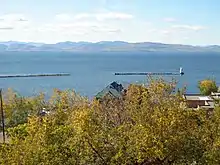 The Burlington Breakwater Lights were originally established in 1857 to mark the ends of a low, detached, two piece breakwater 2⁄3-nautical-mile (1.2 km; 0.77 mi) long which protects the Burlington, Vermont harbor from Lake Champlain.[3] The breakwater is on the National Register of Historic Places,[4] but the lights, being replicas, are not. The two lights were replaced and rebuilt several times as fire and ice took their toll. In the middle of the 20th century, the wood towers were replaced by steel skeleton towers. The City of Burlington arranged for Federal funding for replicas of the original towers which were activated on September 12, 2003.[2]