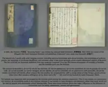 The earliest use of the written term bushidō is in the Kōyō Gunkan in 1616 by Kōsaka Masanobu.[1][10][11][12] In 1685, the ukiyo-e book Kokon Bushidō ezukushi (古今武士道絵つくし, "Images of Bushidō Through the Ages") by artist Hishikawa Moronobu (1618-1694) included the word bushido and artwork of samurai with simple descriptions meant for children.[1] In 1642, the Kashoki (可笑記, "Amusing Notes") was written by samurai Saito Chikamori and included moral precepts which explained the theoretical aspects of Bushido.[1][13] It was written with accessible kana syllabaries and intended for commoners, not warriors.[1] It was very popular among the common population.[1] It showed that bushido had spread among the population.[1] Thus the Kashoki shows that moral values were present in bushido by 1642.[1] The term bushido came into common international usage with the 1899 publication of Nitobe Inazō's Bushido: The Soul of Japan which was read by many influential western people.[14] In Bushido (1899), Nitobe wrote: