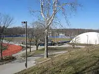 The Butler Bubble is home to the Bulldog men's and women's tennis teams and is used as an indoor practice facility for the Butler baseball, football and soccer teams. All of the Butler tennis teams' home matches during the winter and early spring take place inside the bubble, which is located behind Hinkle Fieldhouse off of 52nd Street. The Bubble was originally constructed at the far west end of the Hinkle Fieldhouse parking lot, but was relocated to along the right field line of Bulldog Park after the original plot was broke for the construction of the new Health and Recreation Complex in the summer of 2005. The Bubble houses four hard-surface tennis courts as well as additional room for storage of equipment for both tennis teams. The bubble itself is supported by higher air pressure inside and is permanently fixed over the courts.