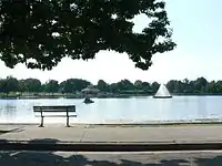 Byrd Park, also known as William Byrd Park, is a public park located in Richmond, Virginia, United States, north of the James River and adjacent to Maymont. The 200-acre (0.81 km2) park includes a mile-long trail with exercise stops, monuments, an amphitheatre, and three small lakes: Shields (sometimes spelled Sheilds), Swan, and Boat Lake. Boat Lake (also called Fountain Lake) has a lighted fountain at its center. Visitors can rent pedal boats there in season. The park includes tennis courts, Little League baseball fields, and a children's playground. The historic round house[1] and Poplar Vale Cemetery are also located in the park. It is named after William Byrd II, whose family owned much of the area when Richmond was founded in 1737. The park was listed on the National Register of Historic Places in 2016.