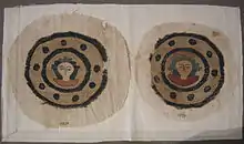 Both Christian and pagan examples, mostly embroidered panels sewn into plainer cloth, have been preserved in the exceptional conditions of graves in Egypt, although mostly iconic portrait-style images rather than the narrative scenes Asterius describes in his diocese of Amasya in northern Anatolia. The portrait of the Caesar Constantius Gallus in the Chronography of 354 shows several figurative panels on his clothes, mostly round or oval (see gallery).