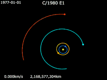 As the comet was approaching on 9 December 1980, it passed within 0.228 AU of Jupiter,[5] which accelerated the comet briefly giving an (epoch 1981-Jan-09) eccentricity of 1.066.[2] The comet came to perihelion on 12 March 1982,[1] when it had a velocity of 23.3 km/s (52,000 mph) with respect to the Sun. Since the epoch of 1977-Mar-04, C/1980 E1 has had a barycentric eccentricity greater than 1,[2] keeping it on a hyperbolic trajectory that will eject it from the Solar System. Objects in hyperbolic orbits have a negative semimajor axis, giving them a positive orbital energy. After leaving the Solar System, C/1980 E1 will have an interstellar velocity () of 3.77 km/s.[lower-alpha 1] The Minor Planet Center does not directly list a semimajor axis for this comet.[6]