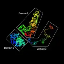 The 3D structure of C2orf16 is predicted to have three major domains. Domain 1 is from amino acids 1 to 662, domain 2 is from amino acids 674 to 1,487, and domain 3 is from amino acids 1,488 to 1,984.[27] Domain 1 and 2 are predicted to be connected via a stretch of 12 amino acids not otherwise organized into a secondary structure allowing flexibility between domains 1 and 2. Domain 2 is predicted to have protein interacting domains for transcription factors.[27] Domain 3 is predicted to follow a "balls on a string" structure[27] and has many sites for possible phosphorylation.[28]