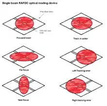 Different brands and models of optical assemblies use different methods of focus detection. On most players, the focus position detection is made using the difference in the current output of a block of four photodiodes. The photodiode block and the optics are arranged in such a way that a perfect focus projects a circular pattern on the block while a far or near focus projects an ellipse differing in the position of the long edge in north–south or west-southwest. That difference is the information that the servoamplifier uses to keep the lens at the proper reading distance during the playback operation, even if the disc is warped.[41]