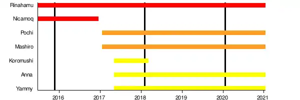 The group released two singles before the additions of three more members in April 2017: Fujishiro Anna (藤城アンナ), former member of Ice Cream Suicide and Bellring Shōjo Heart; Naatan Koromushi (なぁたんコロ虫); and Yamiyume Yamii (病夢やみい).[5][6] The six-person group soon made headlines for an event inviting fans to hug a member, but each member was wearing full chemical protective clothing.[7] Naatan Koromushi left the group in March 2018.[8] As of April 2014, four additional singles and one album were released.